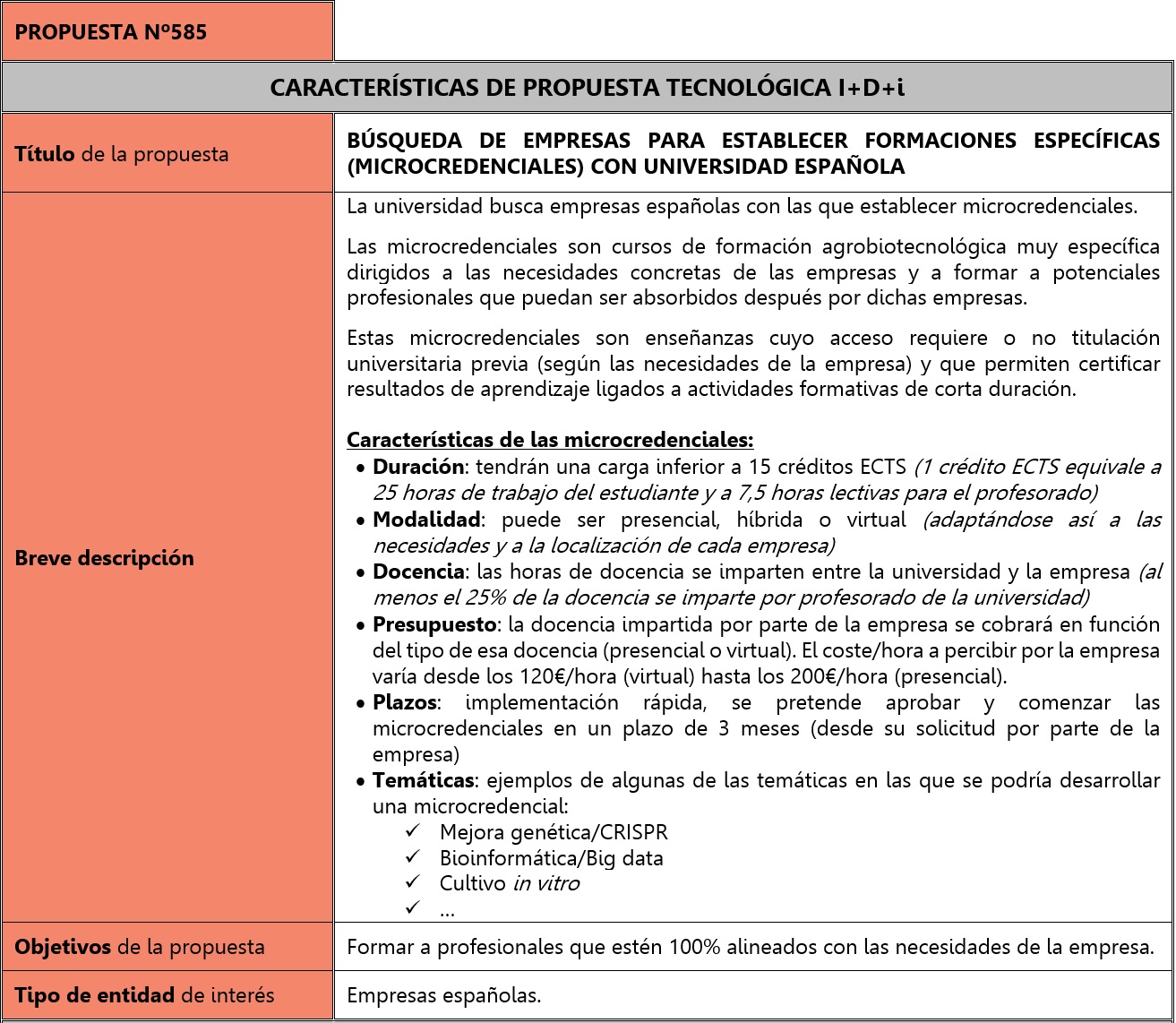 - Propuesta 585: Búsqueda de empresas para establecer formaciones específicas (microcredenciales) con universidad española