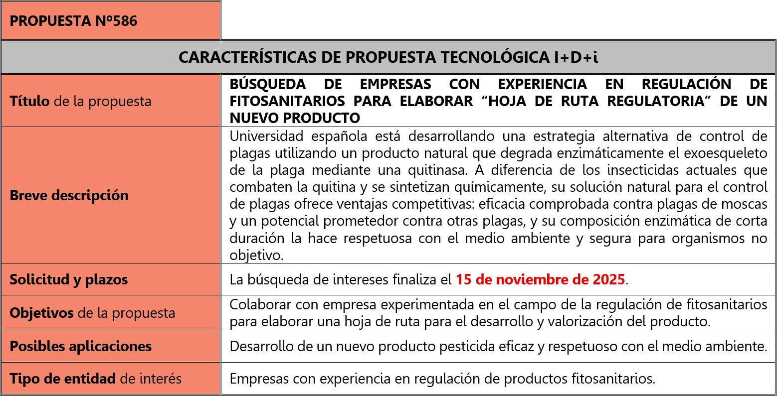 - Propuesta 586: Búsqueda de empresas con experiencia en regulación de fitosanitarios para elaborar «hoja de ruta regulatoria» de un nuevo producto