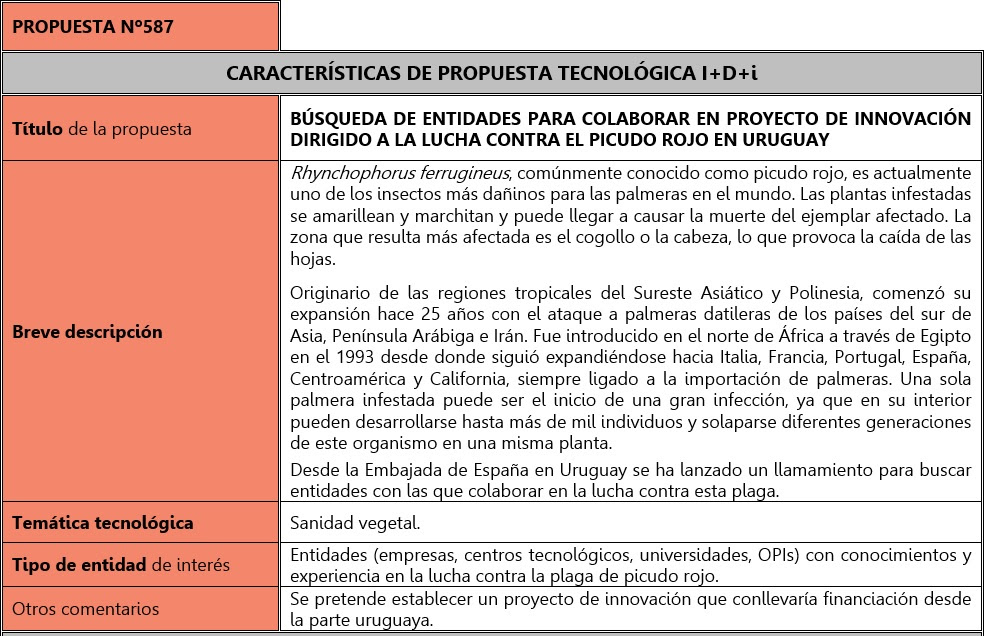 - Propuesta 587: Búsqueda de entidades para colaborar en proyecto de innovación dirigido a la lucha contra el picudo rojo en Uruguay