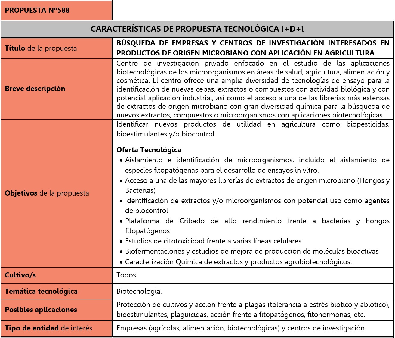 - Propuesta 588: Búsqueda de empresas y centros de investigación interesados en productos de origen microbiano con aplicación en agricultura