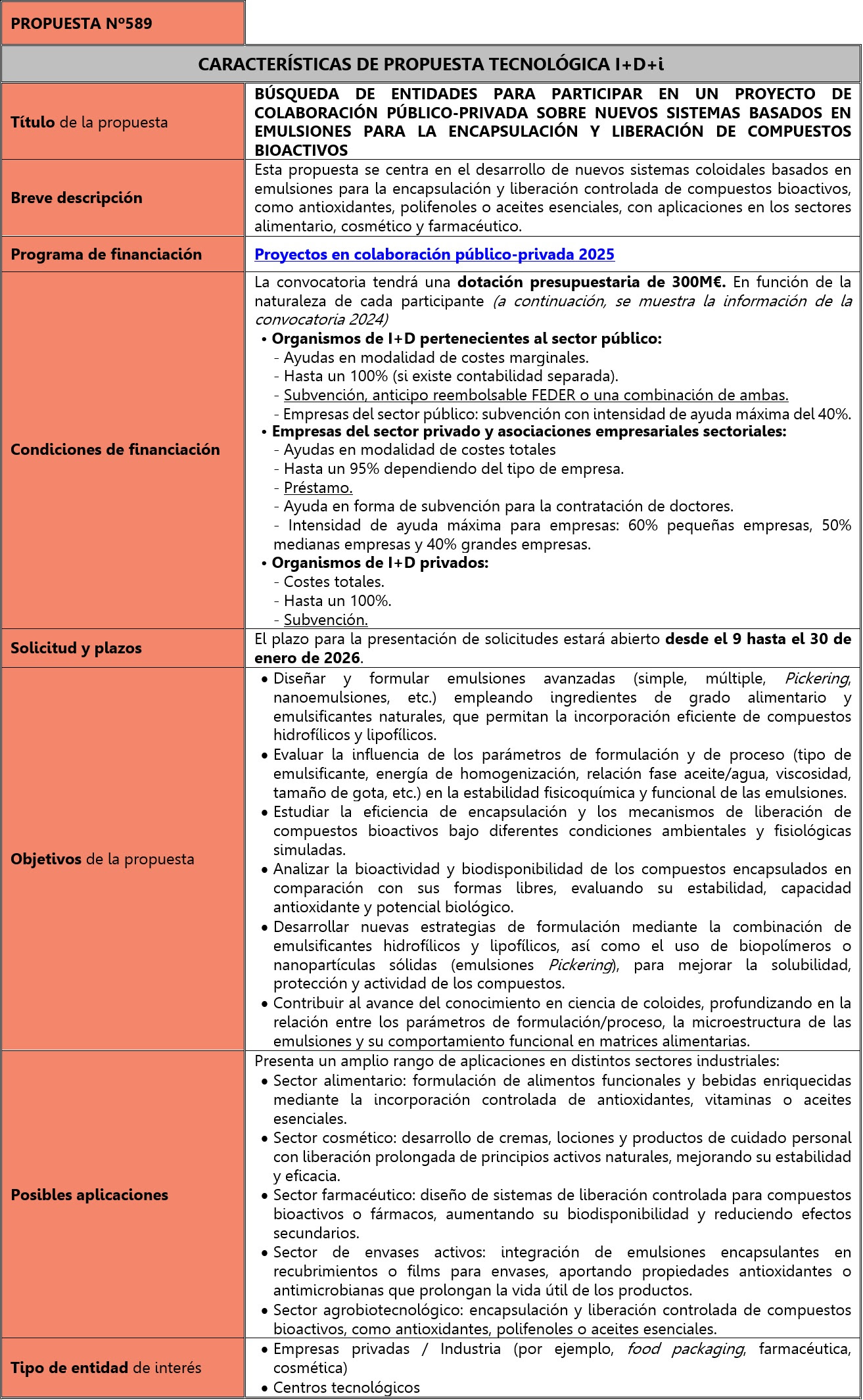 - Propuesta 589: Búsqueda de entidades para participar en un proyecto de colaboración público-privada sobre nuevos sistemas basados en emulsiones para la encapsulación y liberación de compuestos bioactivos