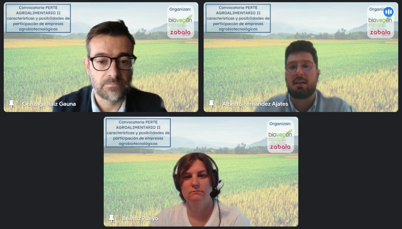 BIOVEGEN, in collaboration with the expert innovation consultancy ZABALA, organized a webinar for its partners on May 28, 2024 with the aim of presenting the PERTE AGROALIMENTARIO 2024 call and other lines of financing relevant to the sector. Around 50 attendees They were able to learn from Beatriz Pueyo, Head of PERTE AGRO at Zabala Innovation, and Alberto Fernández, Innovation and Corporate Strategy Consultant at Zabala Innovation, and under the moderation of Gonzaga Ruiz de Gauna, manager of BIOVEGEN, the news that the new PERTE AGRO call will offer, scheduled for the second semester and which will have 100 million euros in subsidies for innovative projects in agri-food. The webinar was focused on finding alternatives for the participation of agrobiotechnological entities and analyzing the characteristics of PERTE, as well as other upcoming funding calls (TransMisiones, Misiones).